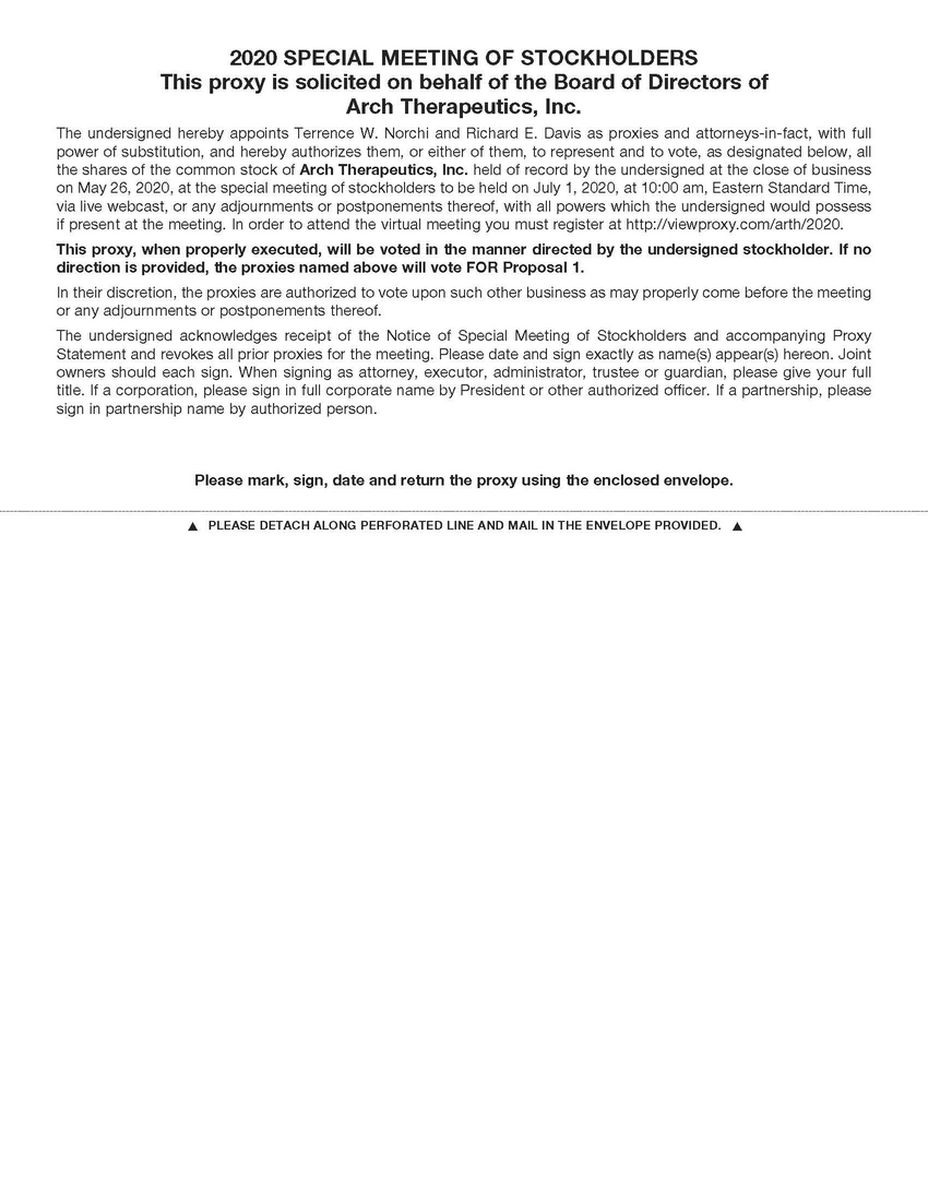 This proxy statement contains information related to the Special Meeting of Stockholders (the “Special Meeting”) of Arch Therapeutics, Inc., a Nevada corporation (“Arch” or the “Company”) to be held on July 1, 2020 at 10:00 a.m. eastern time, or at such other time and place to which the Special Meeting may be adjourned or postponed. Due to concerns regarding the coronavirus outbreak (“COVID-19”) and to assist in protecting the health and well-being of our stockholders and employees, the Special Meeting will be held live via the internet. In order to attend the Special Meeting, you must register at http://viewproxy.com/arth/2020. The enclosed proxy is solicited by the Board of Directors of the Company (the “Board”). The proxy materials relating to the Special Meeting are being mailed to stockholders entitled to vote at the meeting on or about , 2020.