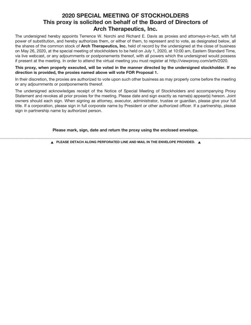 This proxy statement contains information related to the Special Meeting of Stockholders (the “Special Meeting”) of Arch Therapeutics, Inc., a Nevada corporation (“Arch” or the “Company”) to be held on July 1, 2020 at 10:00 a.m. eastern time, or at such other time and place to which the Special Meeting may be adjourned or postponed. Due to concerns regarding the coronavirus outbreak (“COVID-19”) and to assist in protecting the health and well-being of our stockholders and employees, the Special Meeting will be held live via the internet. In order to attend the Special Meeting, you must register at http://viewproxy.com/arth/2020. The enclosed proxy is solicited by the Board of Directors of the Company (the “Board”). The proxy materials relating to the Special Meeting are being mailed to stockholders entitled to vote at the meeting on or about June 5, 2020.